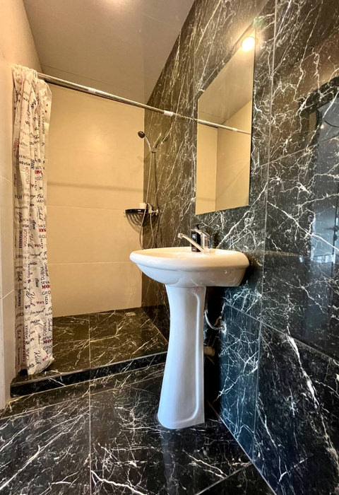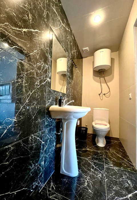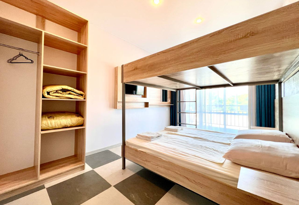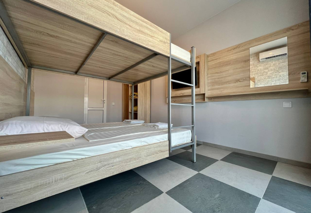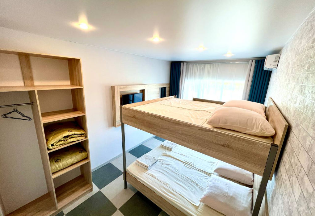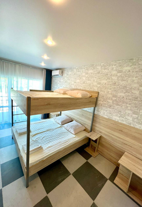 Площадь номера - 18 кв.м. 1 комната. 4 осн. места. В номере: телевизор; холодильник; кондиционер; душ; 2-спальная кровать; 2-ярусная кровать; санузел.
